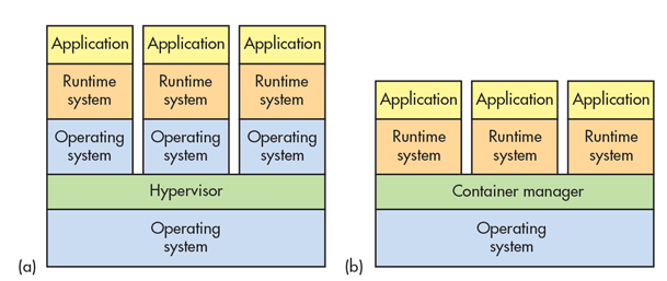 VMs are managed by a hypervisor (aka virtual machine monitor) and utilize VM hardware (1) while containerized systems provide operating system services from the underlying host and isolate the applications using virtual-memory hardware or (2) the container manager provides an abstract OS for the containers. This method eliminates a layer and in doing so, saves resources and provides a quicker startup time, when necessary.